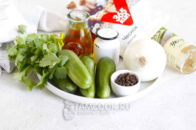 Соберите все продукты по списку и приступим к приготовлению огурцов с жареным луком. Лука в этой закуске должно быть много. На 200 г огурцов у меня ушло 100 г репчатого лука.
