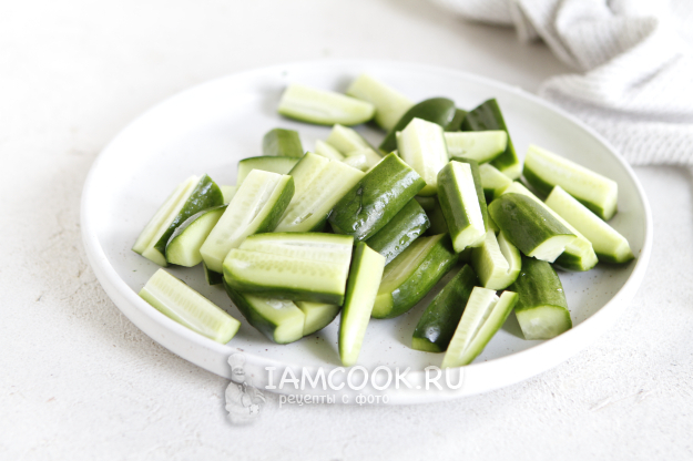 Огурцы промойте, обсушите и нарежьте брусочками, как на фотографии.
