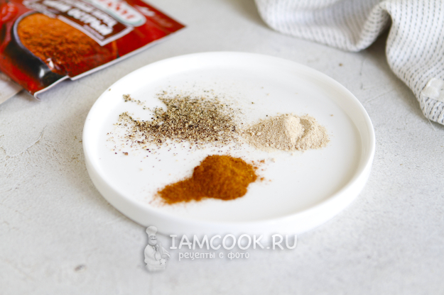 Подготовьте специи: черный молотый перец, красный перец чили молотый и молотый чеснок.