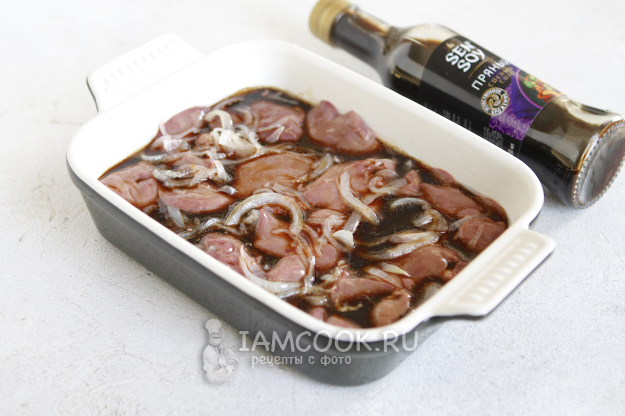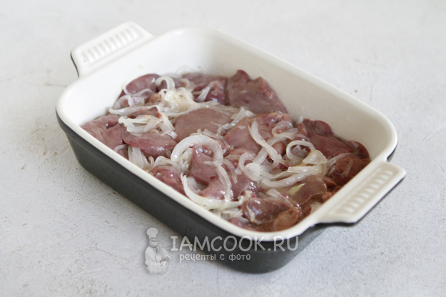 В форму для запекания выложите куриную печень с луком, слегка посолите. Именно слегка, так как соевый соус сам по себе соленый.