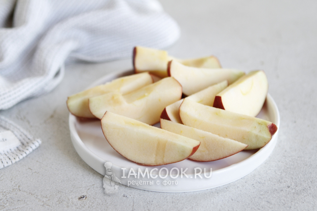 Одно крупное яблоко промойте и высушите, разрежьте на 2 половинки. Удалите сердцевину и семечки, каждую половинку нарежьте на 3-4 дольки.
