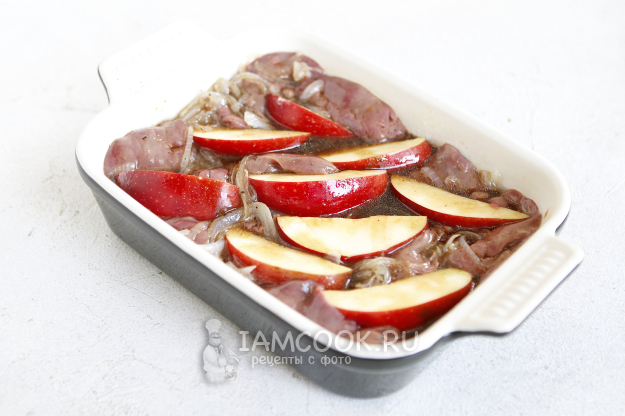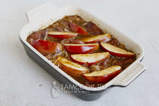 Запекайте куриная печень с яблоками в духовке при 170 градусах 30 минут.