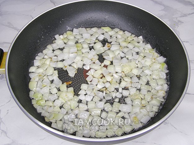 Лук нарезаем кубиками среднего размера и обжариваем на растительном масле до мягкости или до золотистого цвета (как больше нравится).