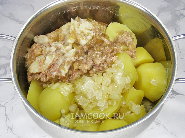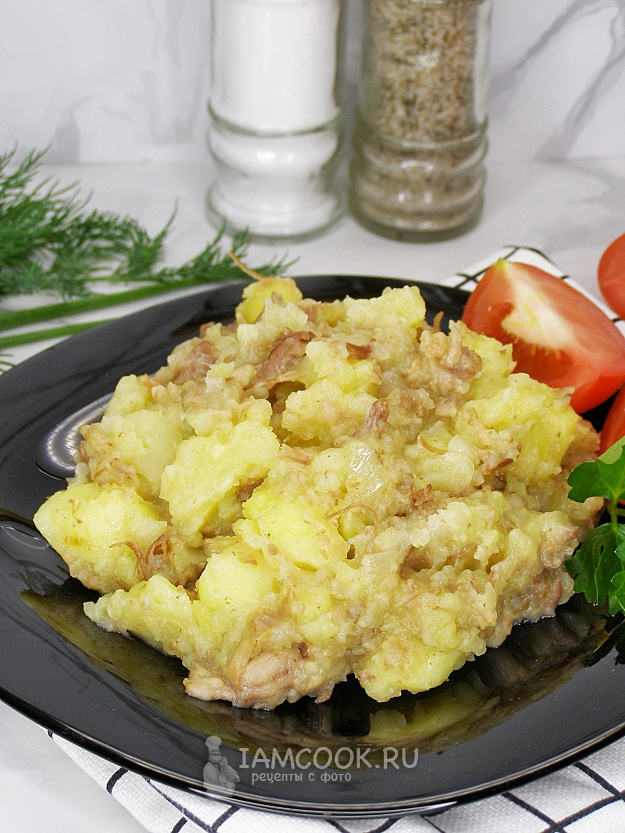 С отваренной картошки сливаем воду, добавляем в неё обжаренный лук и тушёнку (предварительно её можно измельчить ножом прямо в банке). По желанию можно добавить чёрный молотый перец, а также сушёную или свежую зелень. Всё вместе перемешиваем.