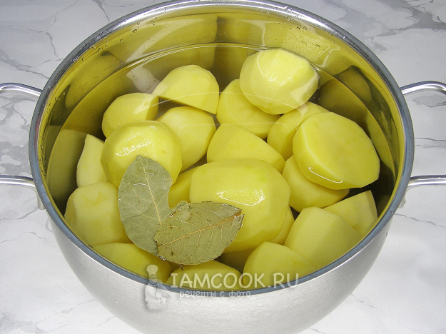 Картофель чистим, заливаем холодной водой. Добавляем в воду соль, лавровый лист и ставим на сильный огонь. Доводим до кипения, затем уменьшаем огонь и варим под крышкой до готовности, примерно 20-30 минут.
