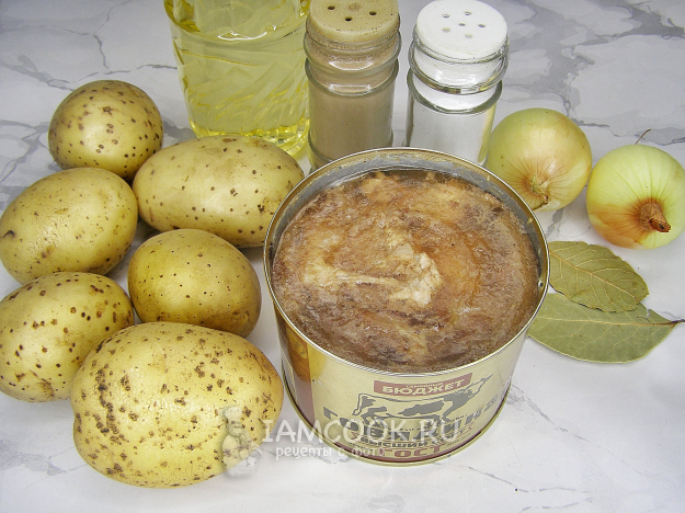 Соберём продукты для приготовления варёной картошки с тушёнкой. Я использовала говяжью тушёнку, подойдёт и свиная. Луковицы у меня были маленькие, поэтому я взяла две штуки. Если у вас крупный лук, достаточно будет и одной.