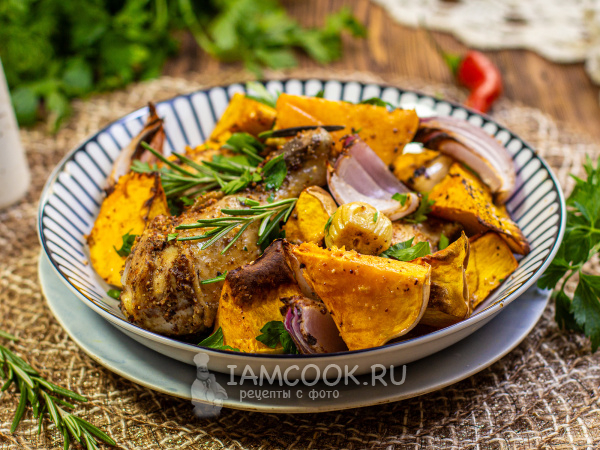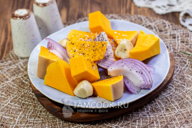 Тыкву, лук и чеснок очистите. Нарежьте тыкву средними кусочками, примерно по размеру как курица. Лук нарежьте на 4-6 части, чеснок оставьте целыми зубчиками. Посолите и поперчите овощи.