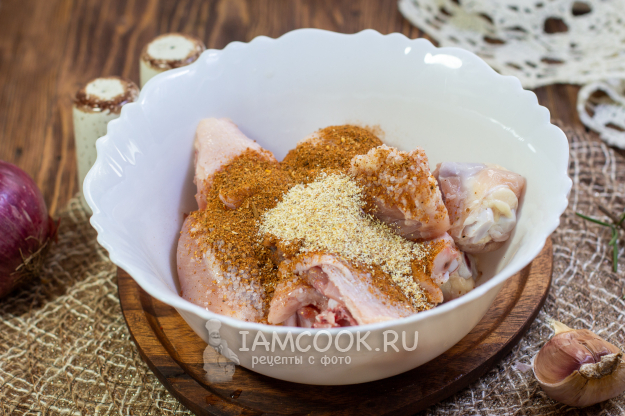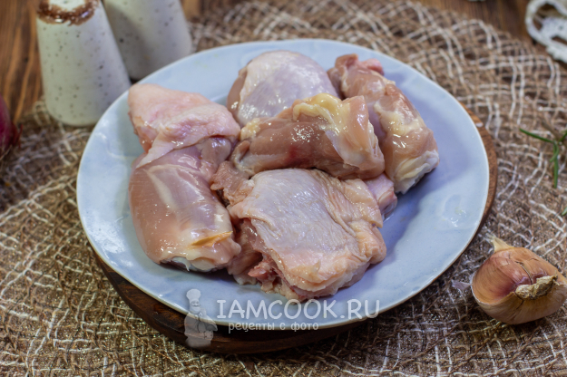 Куриные окорочка помойте и разделайте на 3 части. По желанию снимите кожу. Обсушите курицу бумажным полотенцем.