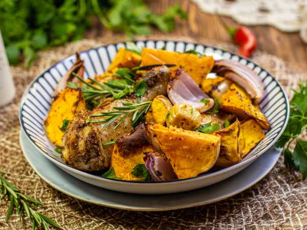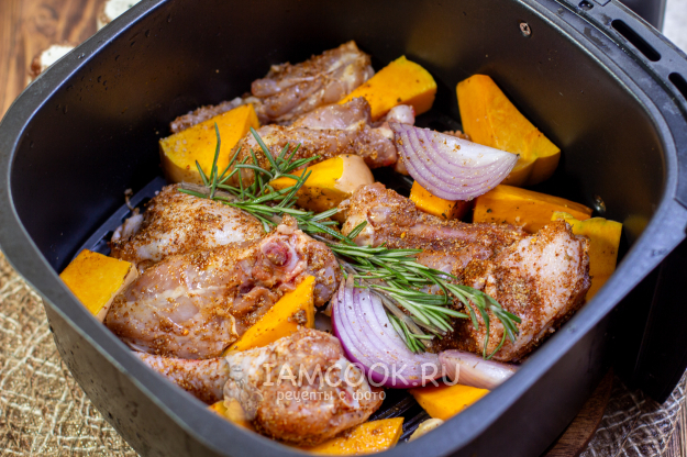 В чашу аэрогриля на решетку выложите замаринованную курицу и овощи. Добавьте веточку розмарина. Готовьте тыкву с курицей в аэрогриле 20-25 минут при температуре 180 градусов.