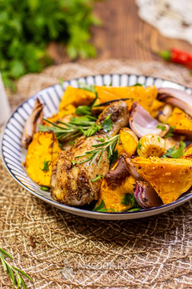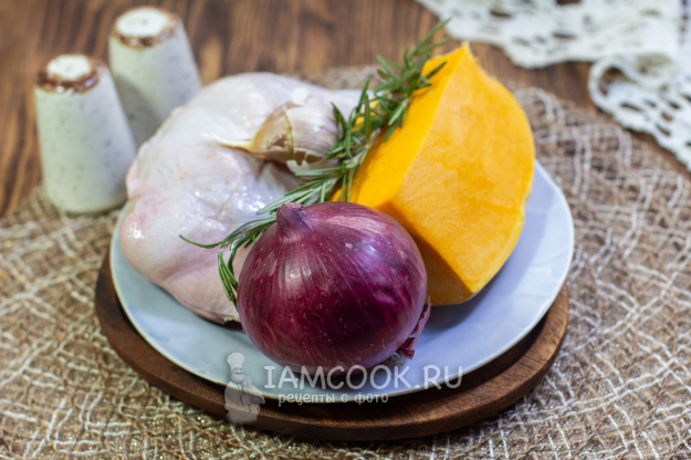 Соберите необходимые продукты для приготовления тыквы с курицей в аэрогриле. Тыкву берите спелую, сочную, с ярким окрасом. Куриные окорочка можете заменить на любые другие части курицы, даже филе.