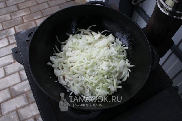 Лук тонко и крупно нашинкуйте, укройте им мясо. Посолите.