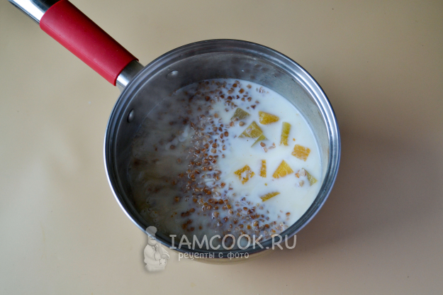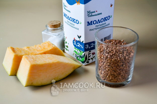 Соберите продукты для приготовления гречневой каши с тыквой на молоке.