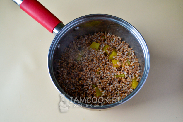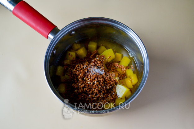 Гречневую крупу промойте в нескольких водах. Промытую крупу положите в сотейник с тыквой. Влейте горячую воду, посолите. Поставьте на огонь.
