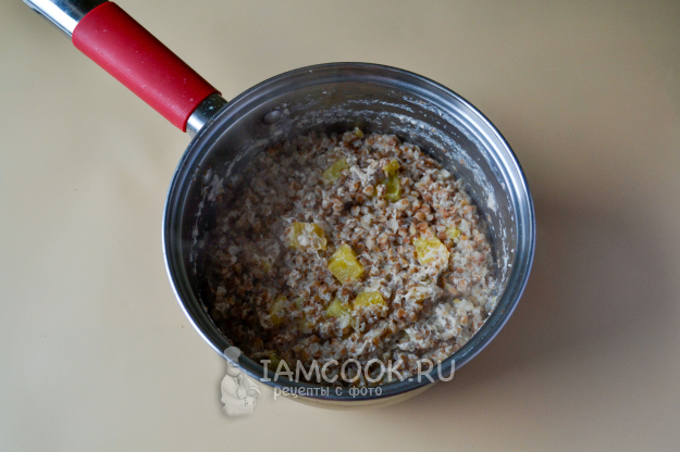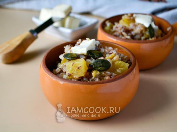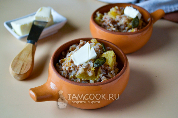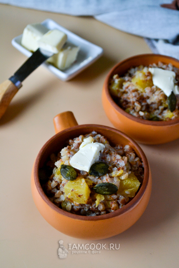 Гречневая каша с тыквой на молоке готова. Обязательно положите кусочек сливочного масла в кашу. Добавьте тыквенные семечки по желанию.