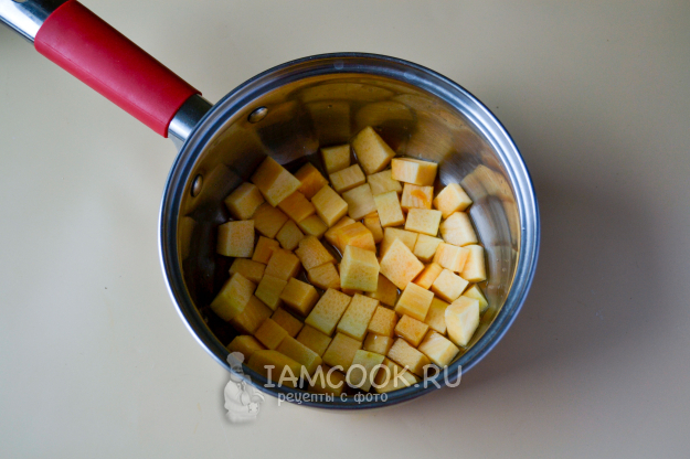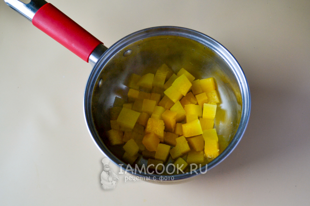 Тыкву очистите от кожуры и семечек, нарежьте небольшими кубиками, сложите в сотейник или кастрюлю, влейте воду, чтобы только покрыла кусочки.