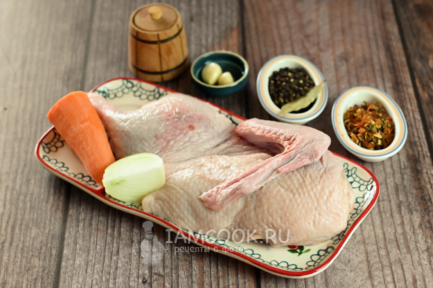 У меня половинка тушки утки, оставшаяся от приготовления другого блюда, ее и сварю. Подготовьте все продукты, и я расскажу вам, как варить утку в кастрюле.