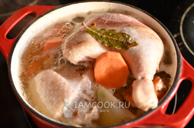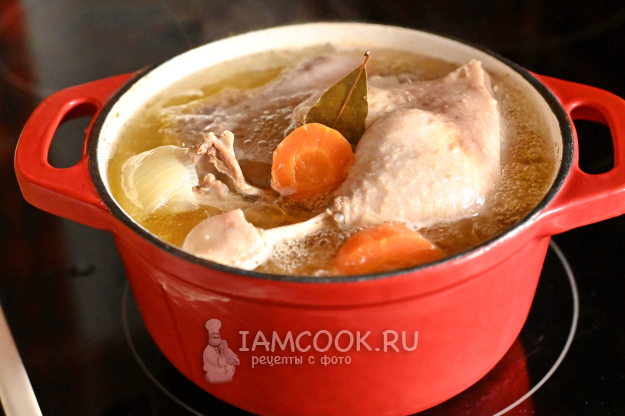 Дальше всё просто - ставим кастрюлю на плиту, даем закипеть. Если появляется пенка, то ее убираем. После закипания огонь убавьте до среднего или чуть ниже.