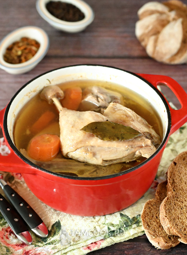 Удобно ещё и тем, что готовая утка в бульоне не пересыхает и может там подождать некоторое время, если обед задержался, например. Потом можно чуть подогреть и подать уточку к столу.