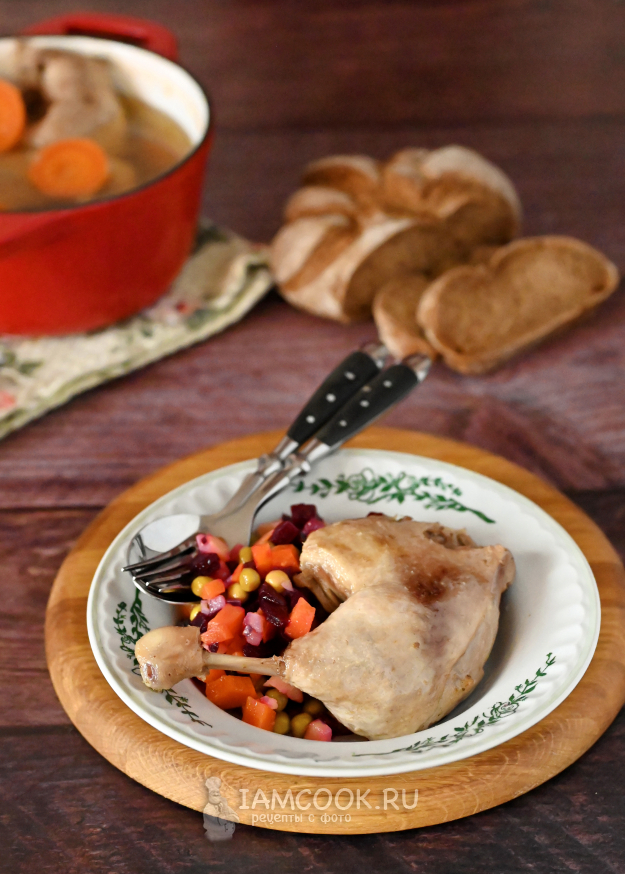 Ориентируйтесь на мягкость мяса. Через час проткните самый толстый кусок ножом, и если мягкость мяса вас устроит, то вареная утка готова!