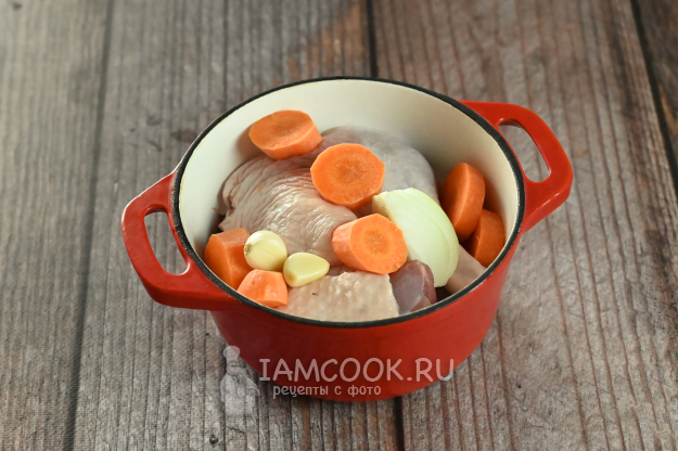 В кастрюлю сложите куски утки, добавьте очищенную луковицу (у меня четвертинка крупной) и нарезанную крупными шайбочками морковь.