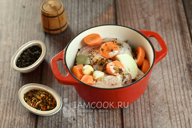 2. Количество воды равно во весу количеству утки. Меньше можно, а вот больше - нежелательно, иначе вы рискуете перейти от просто вареной утки в сторону утиного бульона. Надо понимать, что чем больше воды, тем больше она вытянет вкуса из утки.