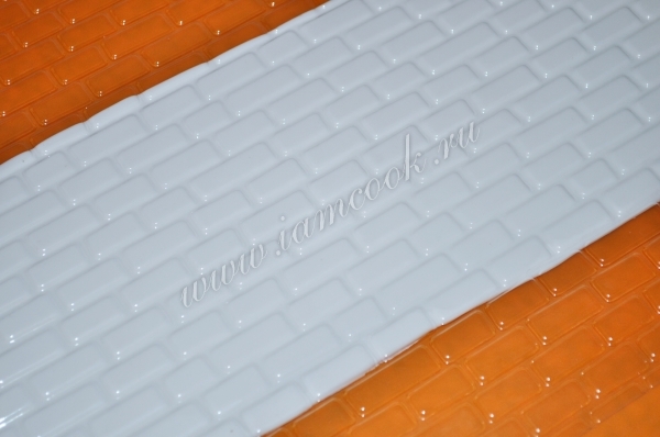 Будем покрывать домик мастикой. Стены дома будут белые. Используем специальный рельеф кирпичики. Но если такового нет, то можно рельеф нанести и вручную, т.к домик маленький.