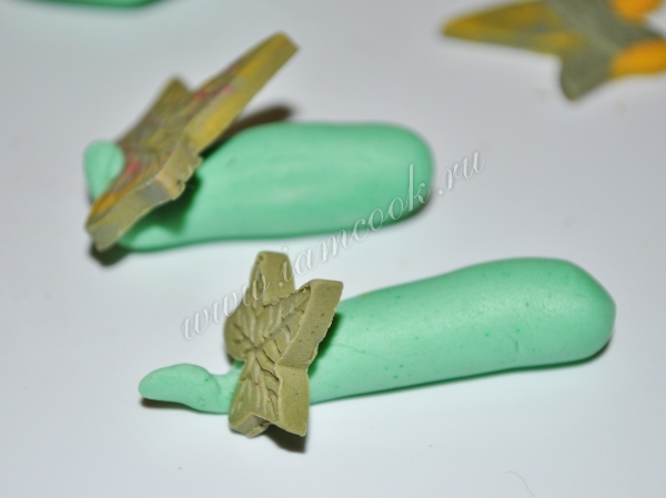 Из мастики более светлого тона интуитивно делаю кабачки и прикрепляю к ним листики и тоже откладываю сушить.