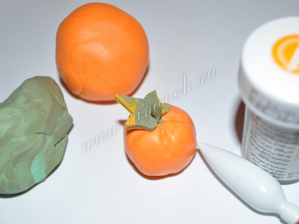 А чтобы сделать тыквы мастику оранжевого цвета скатываю в шарики и палочкой делаю бороздки.