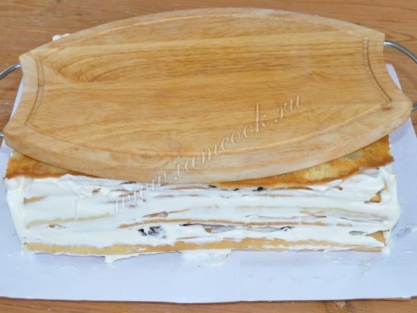 Промазываем каждый корж кремом и кладём кусочки нарезанного чернослива. Собираем торт. Что бы поверхность была ровная можно на верхний корж положить доску и торт выровняется. На торт используем 10 коржей, а два пойдут на дачный домик.