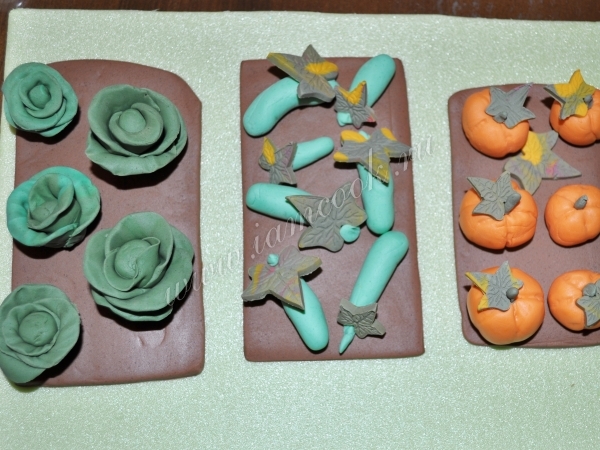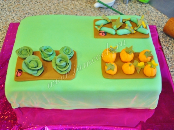 Раскатываем зелёную мастику и накладываем на торт, обрезаем всё лишнее. Готовые грядки с овощами клею на капли мёда.