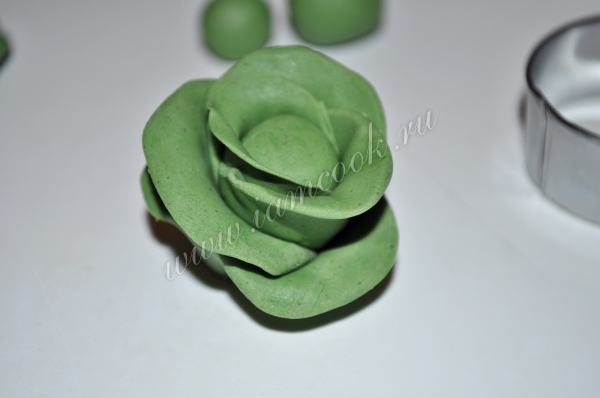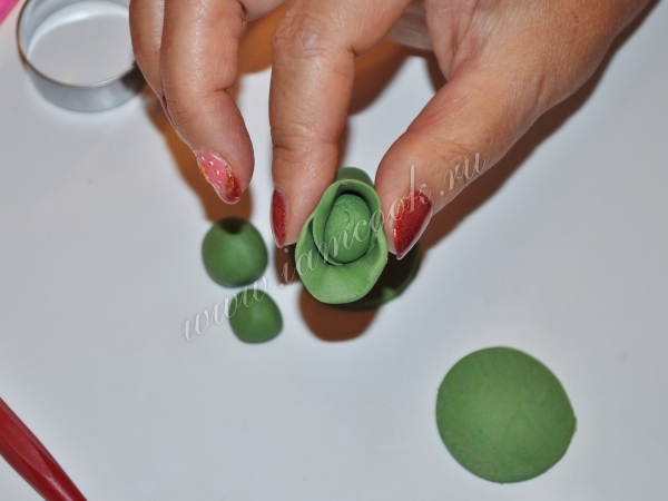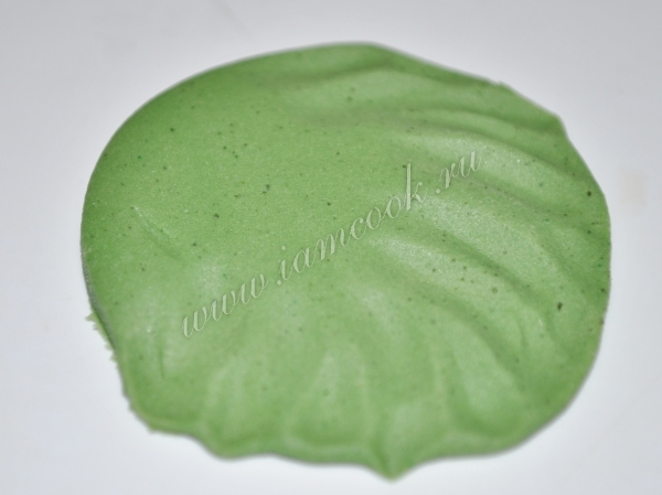 Ещё из зелёной мастики будем делать капусту. Для этого мастику раскатаем и вырежем кругляшки. край кружков истончим, сделаем похожим на капустный лист.