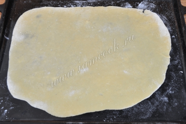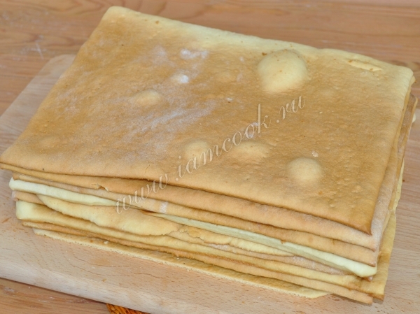 Тесто собрать в шар, разделить на 12 частей и катать тонкие коржи. Сразу выпекать каждый корж по 4-6 минут.