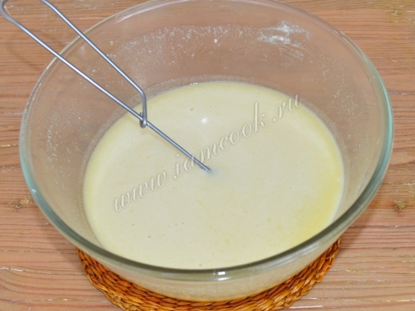 Далее всыпаем соду, смесь вспенится и увеличится в объёме и добавляем 2 стакана муки, перемешиваем.