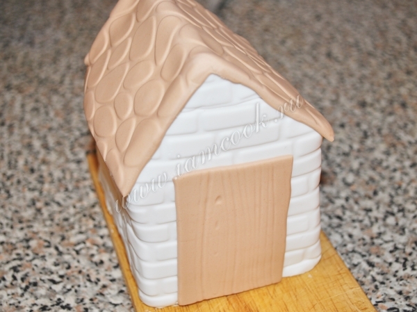 Накладываем мастику на крем и плотно прижимаем. Отрезаем ножницами всё лишнее. Сделаем дверь и приклеим к стене дома, слегка смочив её водой.