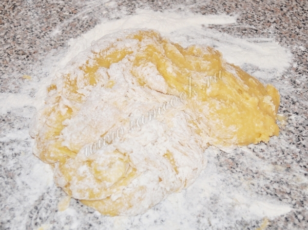 Остальную муку выкладываем на стол и выкладываем смесь. По немного подмешиваем муку и заводим тесто.