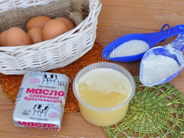 Когда декор подсох можно заняться выпеканием торта. Для медовых коржей приготовим масло, яйца сахар, мёд, соду и муку.