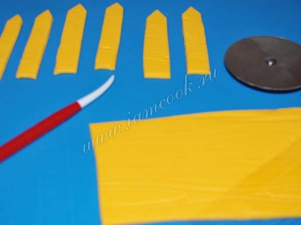 Из мастики жёлтого цвета нарезаю штакетник для забора и тоже оставляю на ровной поверхности для высыхания.