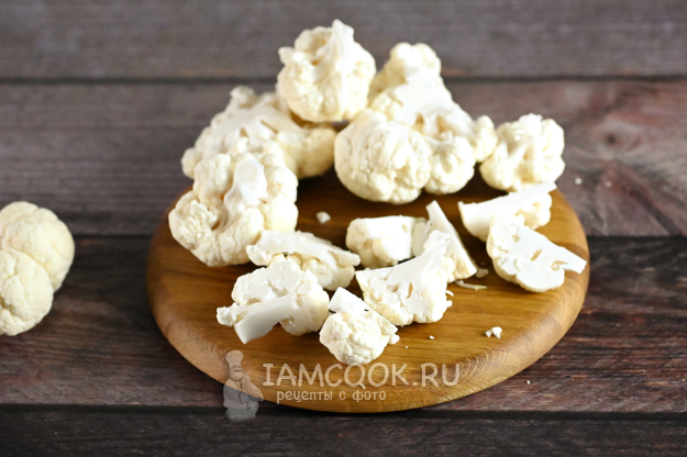 Кочан цветной капусты ополосните, отряхните от воды и разберите на соцветия. Самые крупные соцветия разрежьте на половинки или четвертинки. Все кусочки цветной капусты должны быть примерно одинакового размера, чтобы приготовились равномерно.