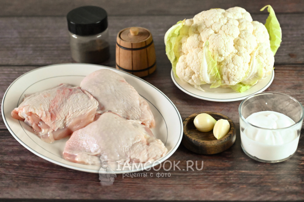 Соберите все необходимые продукты и начнем готовить запеченные куриные бедра с цветной капустой в духовке.