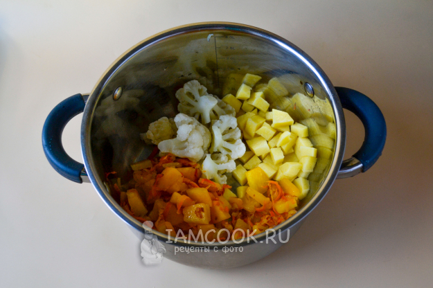 В кастрюлю положите овощи со сковороды, цветную капусту, нарезанный на кубики картофель.