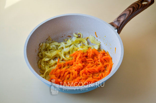 На разогретую с растительным маслом сковороду положите натертую на крупной терке морковь и нарезанный лук.