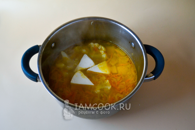 Доведите бульон до кипения, проварите несколько минут и положите в кастрюлю плавленый сыр. Варите суп до полной готовности овощей и расплавления сыра. Попробуйте суп на соль. Посолите по вкусу.