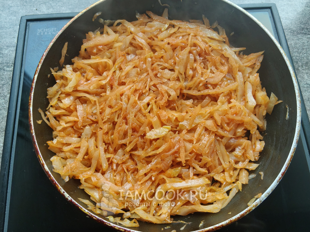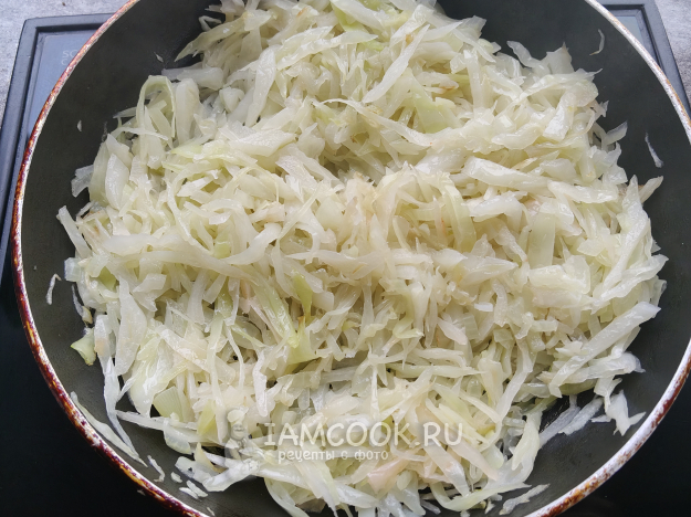 Нагреть в сковороде масло, выложить капусту, потушить ее под крышкой, помешивая.