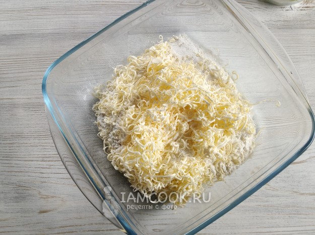 В муку добавить соль, сахар, разрыхлитель, перемешать. Натереть на терке масло или просто нарезать ножом.