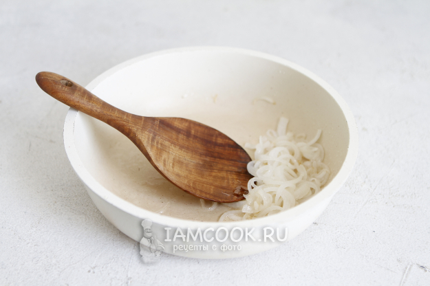 Почистите небольшую головку репчатого лука. Лук нарежьте полукольцами и припустите на растительном масле до мягкости.