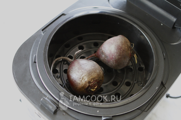 Чашу мультиварки заполните водой, в корзину выложите свёклу. Установите режим "Приготовление на пару", время - 60 минут.