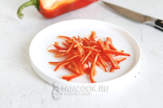Болгарский перец промойте, обсушите, очистите от семян и нарежьте также тонкой соломкой.