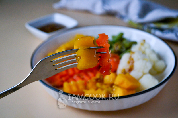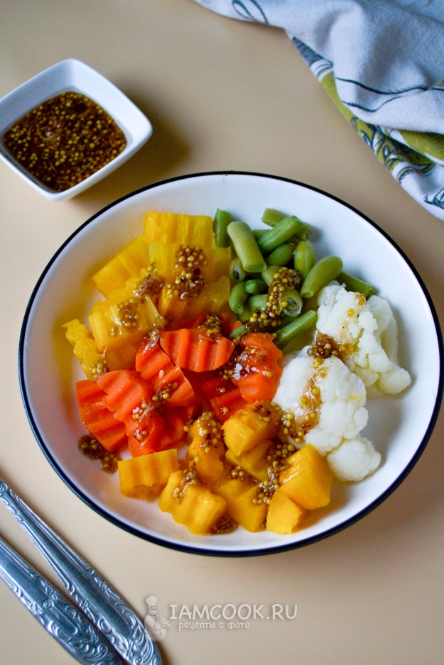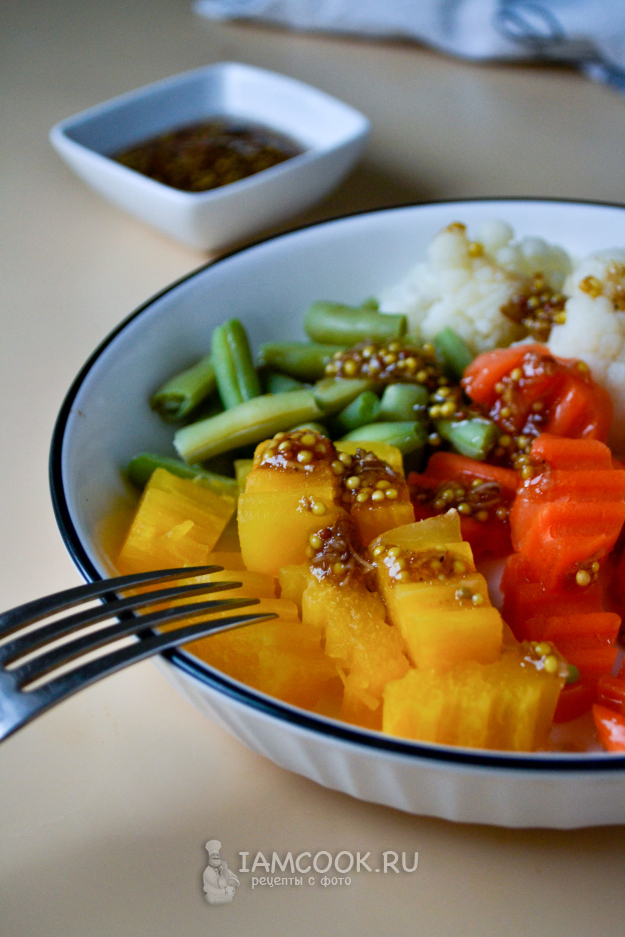 Всё, приготовленные на пару овощи с соусом готовы к дегустации.