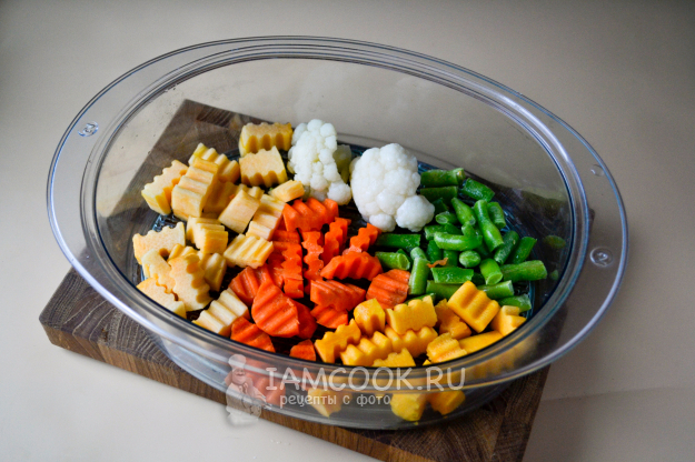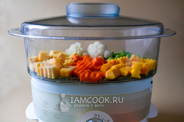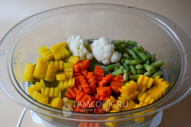 В поддон пароварки положите нарезанные овощи, а также цветную капусту и стручковую фасоль. Кроме этих овощей, можно взять сладкий перец, баклажан, брокколи, зеленый горошек.