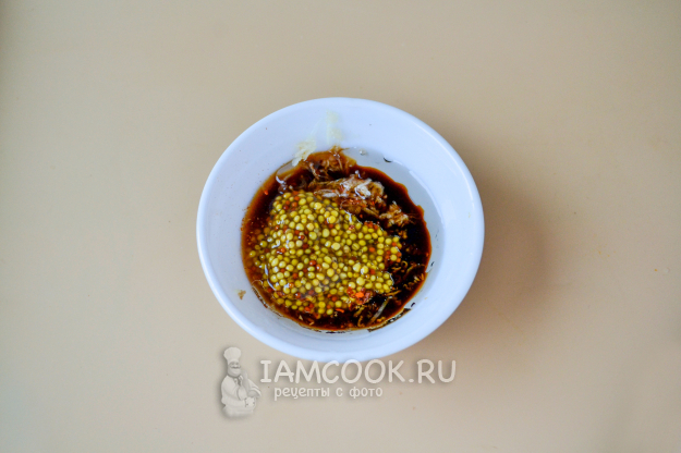 В это время приготовьте соус. В мисочку пропустите через пресс зубчик чеснока, влейте рисовый уксус, соевый соус, зернистую горчицу, растительное масло и красный или черный молотый перец. Перемешайте.